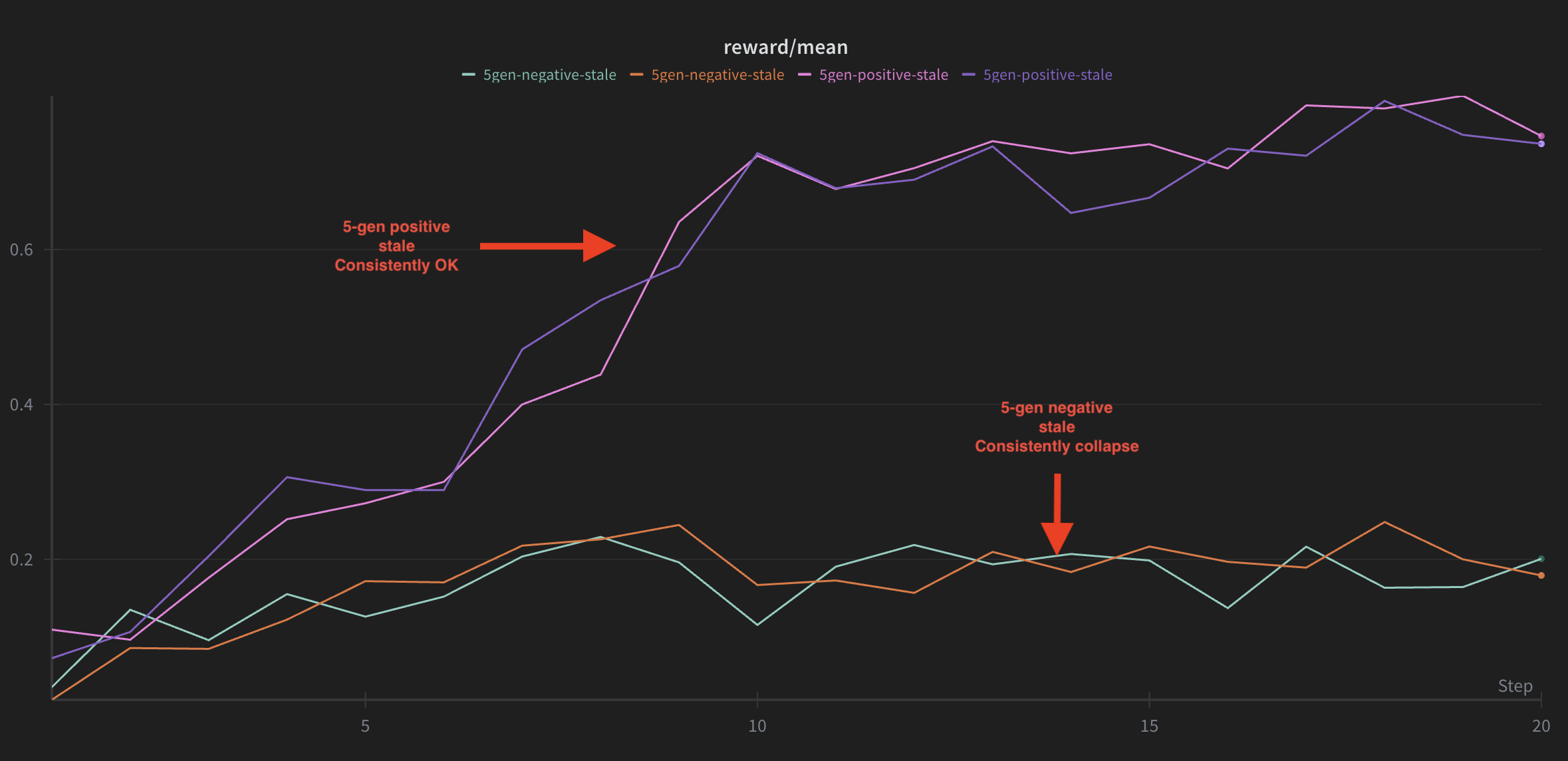 - With negative rewards, training catastrophically collapses at 5 steps of staleness (0.72 → 0.18, a 75% drop)