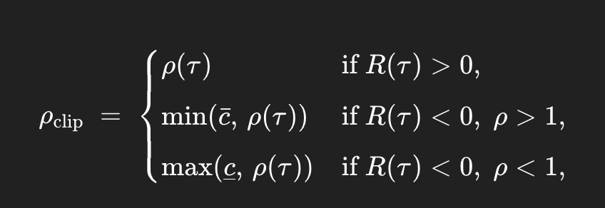 - Negative rewards + high $\rho$: Cap at 1.0 to prevent amplifying negatives the model now prefers