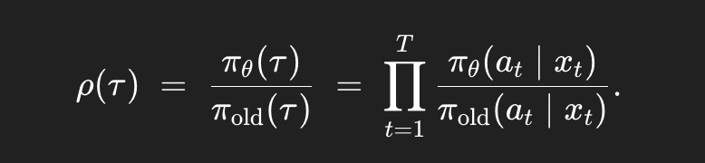 rho: Importance ratio π_θ(τ) / π_old(τ)