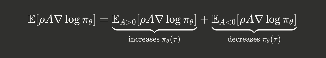 - For positives $(A > 0)$ : The gradient increases $\log \pi_\theta(\tau)$ , pulling the policy toward these trajectories